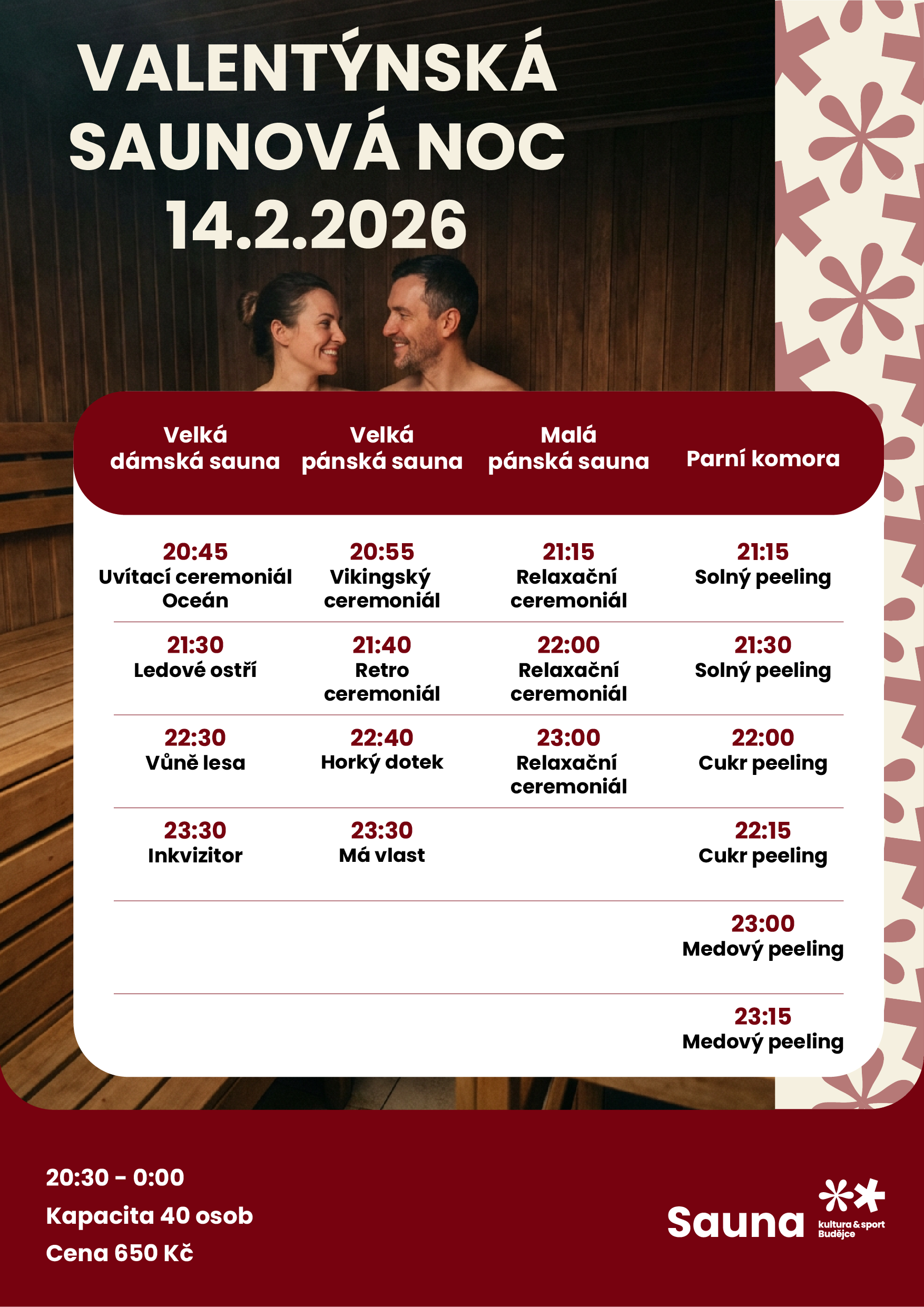 Z důvodu konání Saunové noci bude dne 14.2.2026 provozní doba sauny do 19:00.